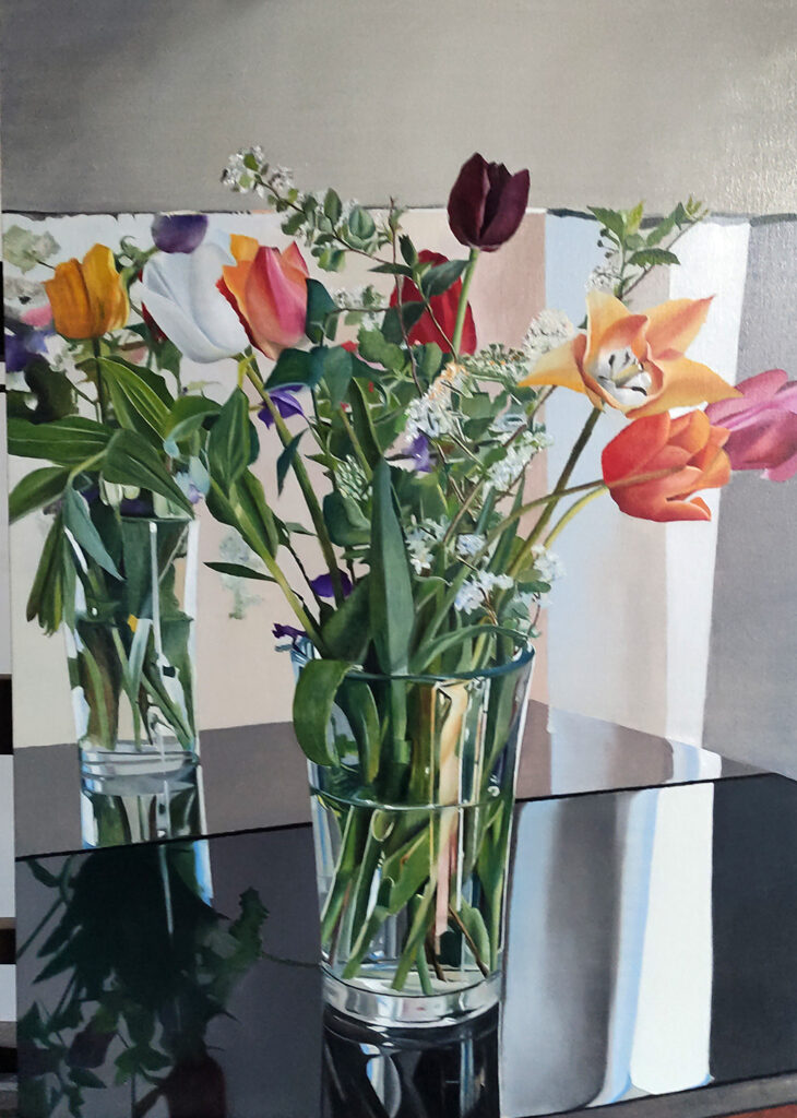 „Bunte Tulpen im Spiegel“ – Öl und Tempera auf Leinwand, 50 auf 70 cm, 2026